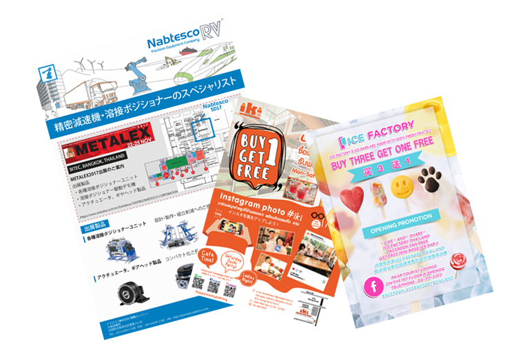 ใบปลิวที่จะแจกจ่ายในปริมาณมาก เรามุ่งเน้นการออกแบบที่มีความโดดเด่นสะดุดตา เพื่อให้มีผู้คนสนใจและอ่านกันมากที่สุด